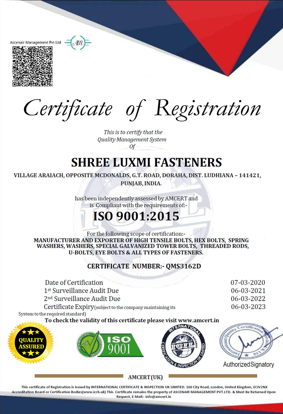 Shree Luxmi Fasteners are guided by a set of stringent quality control policy adopted by the management. According to this, we seek to maintain qualitative production system at every stage of the manufacturing. After sales service is the integral part of our quality control policy. Besides, our products are tested on the parameters like Abrasion resistance, Length and diameter, Corrosion resistance, Tensile strength, Metric bolt strength and Thread dimensions.